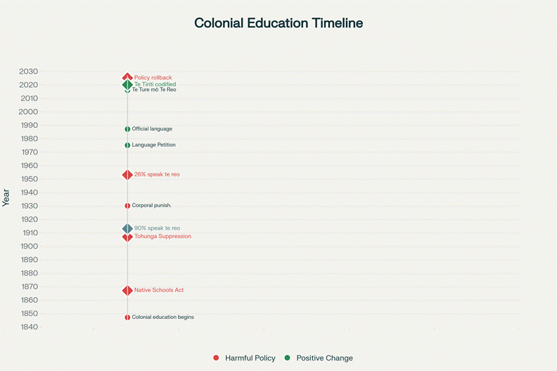 Timeline visualization showing key colonial education legislation and policies from 1847-2025, demonstrating systematic suppression of mātauranga Māori and te reo, followed by partial revival, and current government rollback.