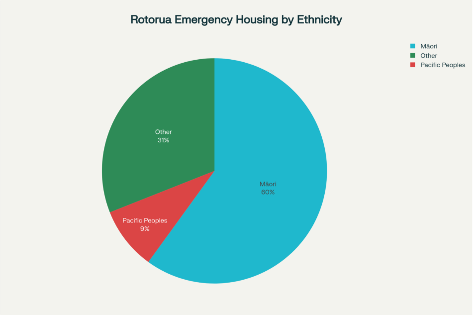 Māori comprise 60% of emergency housing clients nationally as of March 2025, despite representing only 17.3% of the population. In Rotorua specifically, this overrepresentation was even more pronounced during the motel era. Yet when the government tightened emergency housing gateway criteria in August 2024, decline rates skyrocketed from 4% (March 2024) to 32% (March 2025). The reasons for decline reveal systemic bias: “circumstances could have been reasonably foreseen” (22.5%), “not eligible for a grant” (16.7%), “not an emergency situation” (14.7%).[26][14][27][28][1][21][7][10][29]