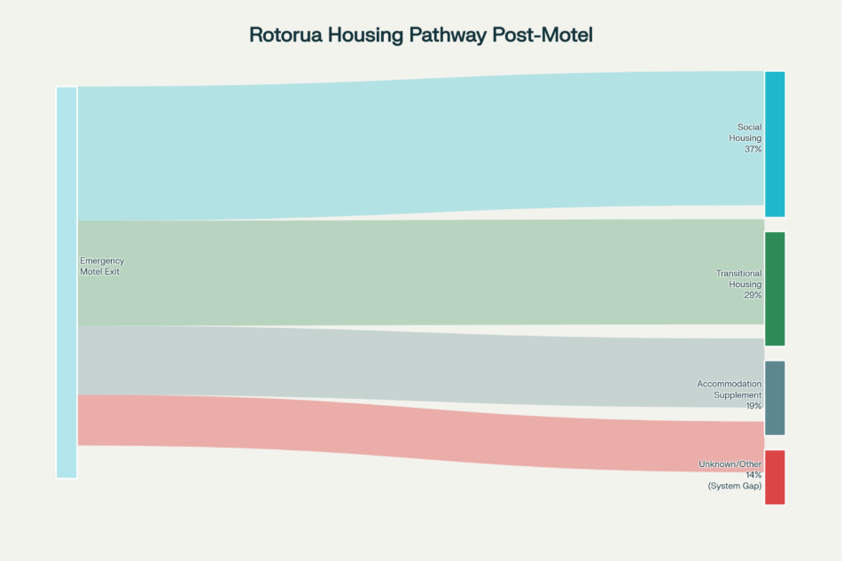 Emergency motel closures severed whānau connections. Rotorua motels housed 240+ households at peak, many relocated from Tauranga, Whakatāne, Taupō, and further afield. When motels closed, 14% of exits went