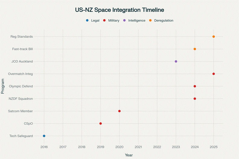 The proposed New Zealand satellite follows this blueprint. Collins emphasizes it will provide “regular coverage of areas of national interest” while “reducing government reliance on external providers” - language suggesting sovereign capability. Yet New Zealand Space Strategy 2024-2030 explicitly prioritizes expanding “operational space cooperation with our international defence and security partners”, positioning sovereign satellites as contributions to “collective security efforts.” The strategy warns “potential for conflict in space creates additional risks to New Zealand’s interests, including potential for disruption to critical national infrastructure.”