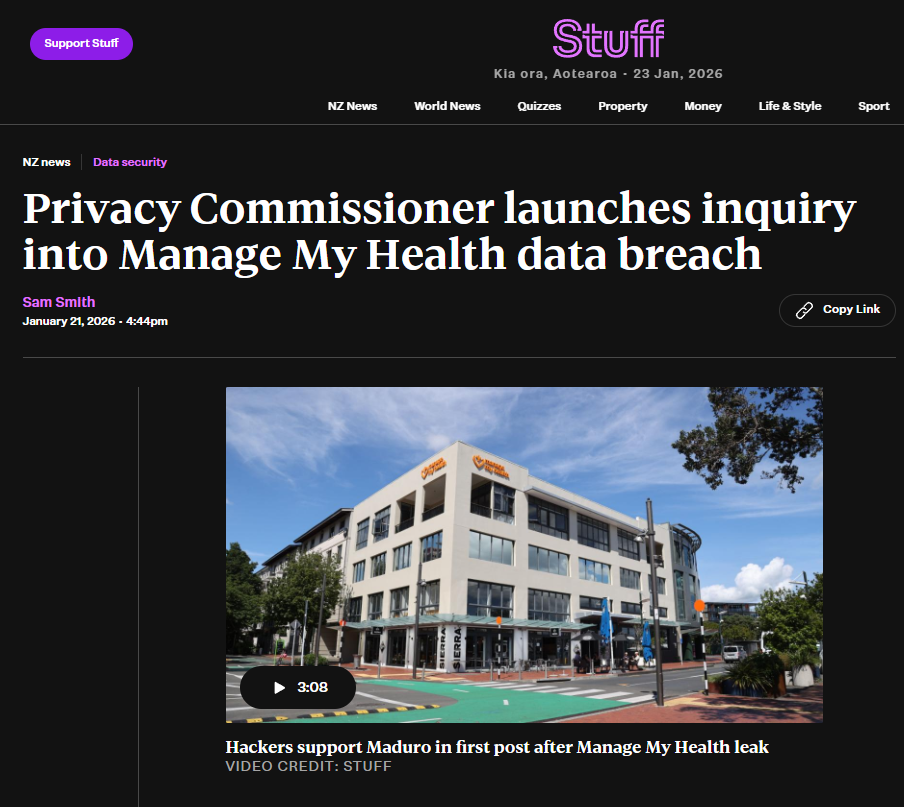On January 20, 2026, Privacy Commissioner Michael Webster announced an “inquiry into the Manage My Health cybersecurity breach.”