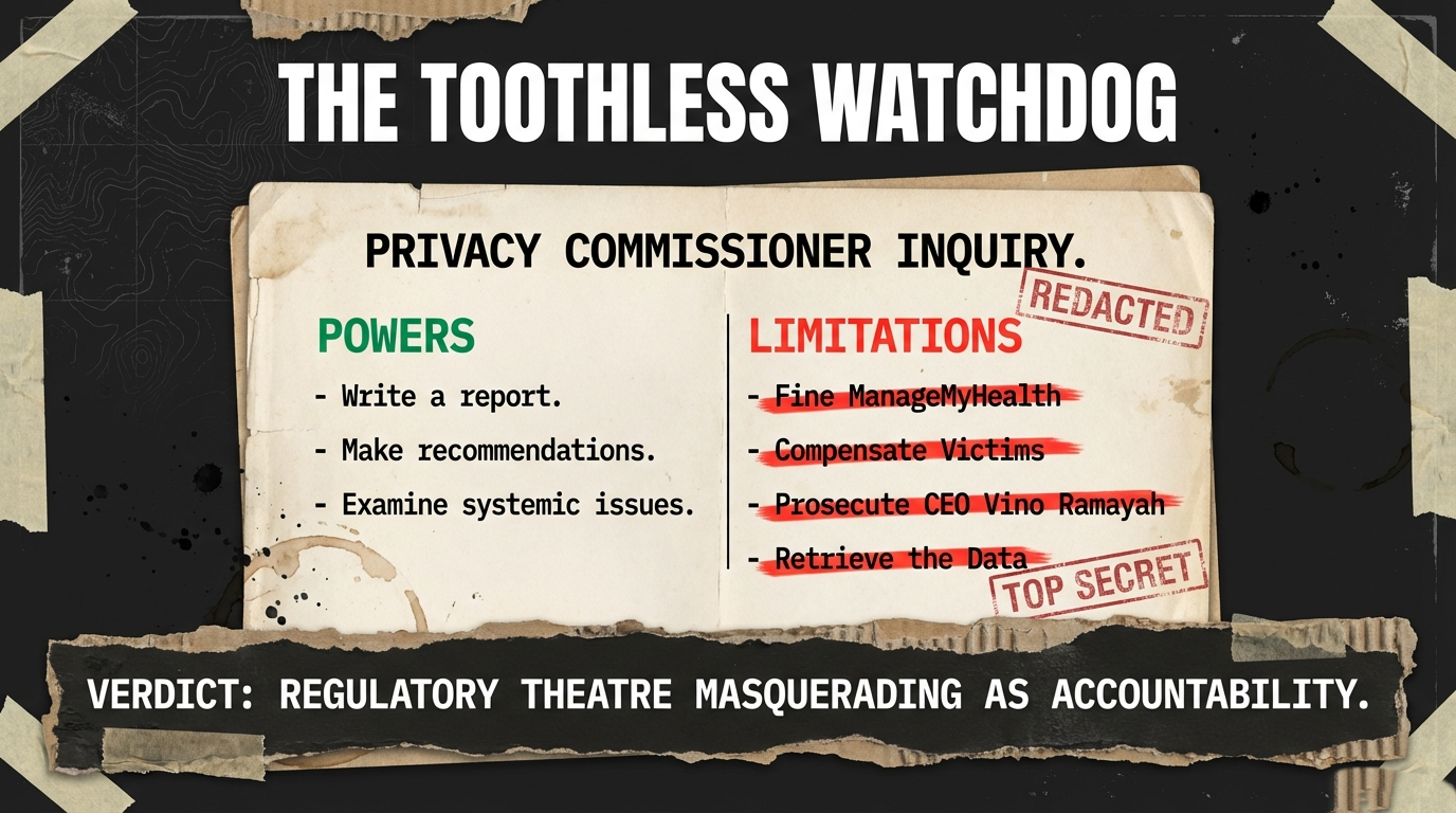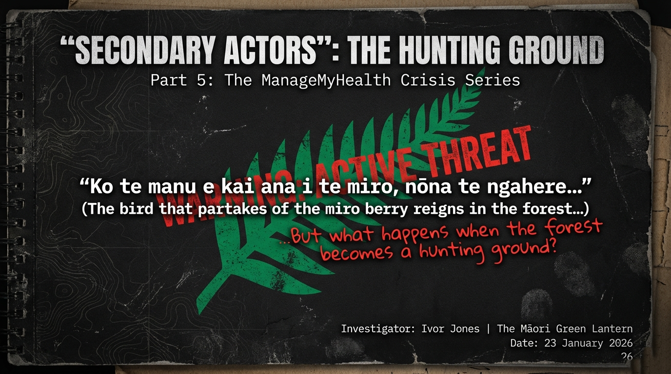 And when the Privacy Commissioner’s inquiry produces its toothless report, when ManageMyHealth’s CEO walks away consequence-free, when the “secondary actors” move on to their next hunting ground—you remember.