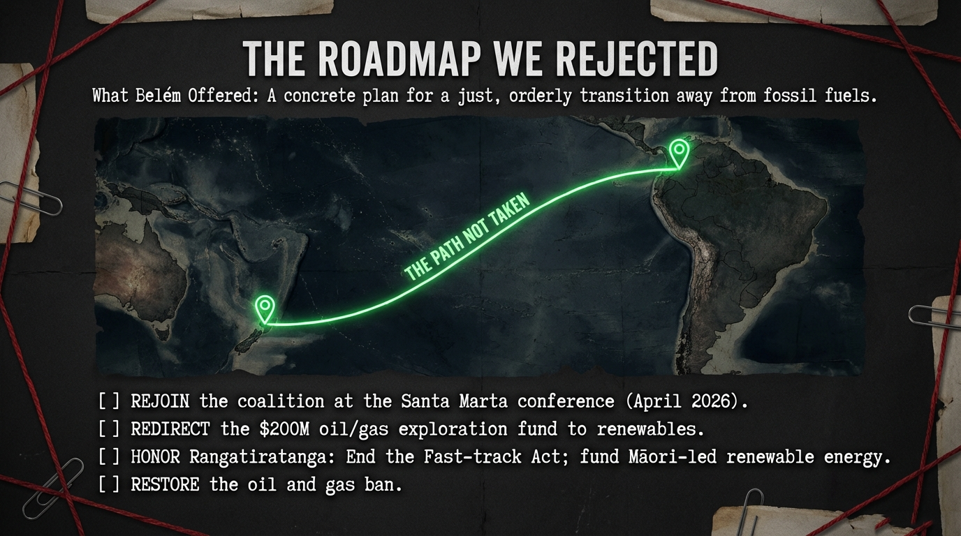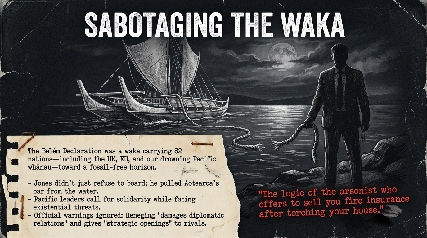 When Resources Minister Shane Jones vetoed New Zealand’s participation in the Belém Declaration on transitioning away from fossil fuels at COP30 in November 2025, he did not simply decline to sign a piece of paper. He severed Aotearoa from a coalition of 82 nations—including our Pacific whānau in Fiji, Vanuatu, Tuvalu, and the Marshall Islands—who are literally drowning as seas rise and who dared to demand a concrete roadmap to phase out the fuels causing their extinction. Jones, with the stroke of bureaucratic consultation, chose Australian mining profits and foreign shareholders over the survival of our closest neighbours.