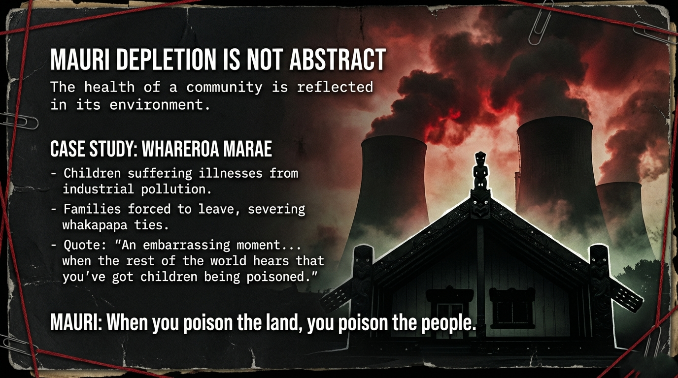 The mauri depletion is not abstract. It translates directly to community harm. Whareroa Marae in Bay of Plenty has documented children suffering illnesses from proximity to industrial area pollution, with one representative telling the UN: