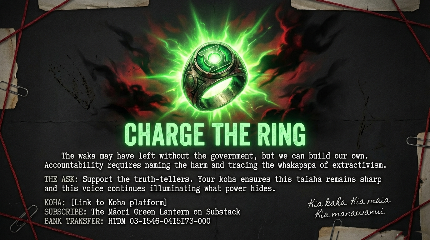 The choice before whānau is clear: fund the accountability structures that name these harms and demand solutions, or allow extractivist politicians to continue mortgaging our future for their political survival and their corporate donors’ profit. The Ring illuminates what power obscures. The taiaha defends what colonialism targets. The whakapapa connects us all—to each other, to whenua and moana, to mokopuna not yet born.