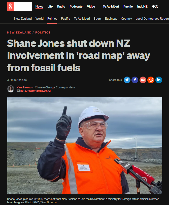 But Jones is not acting alone. He operates within coalition government dynamics where New Zealand First at 8% wields disproportionate influence, and where National allows junior coalition partner to dictate climate policy. Prime Minister Christopher Luxon bears responsibility for enabling this; Climate Change Minister Simon Watts bears responsibility for refusing to state his own position and allowing Resources Minister to overrule climate policy.