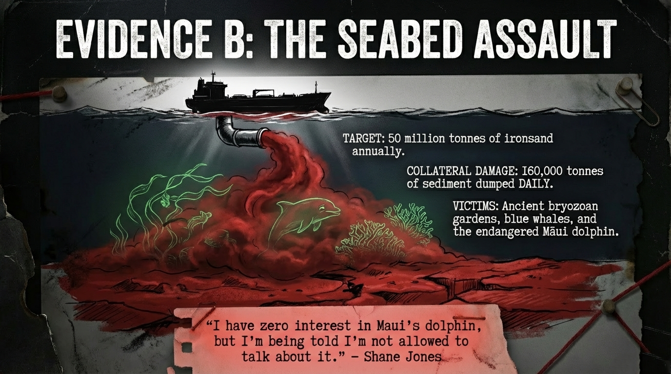 This statement—shocking in its callousness—reveals Jones’s worldview: the environment has value only insofar as it can be monetized. Taonga species, kelp forests, bryozoan gardens discovered by NIWA in the South Taranaki Bight—all expendable for ironsand extraction.