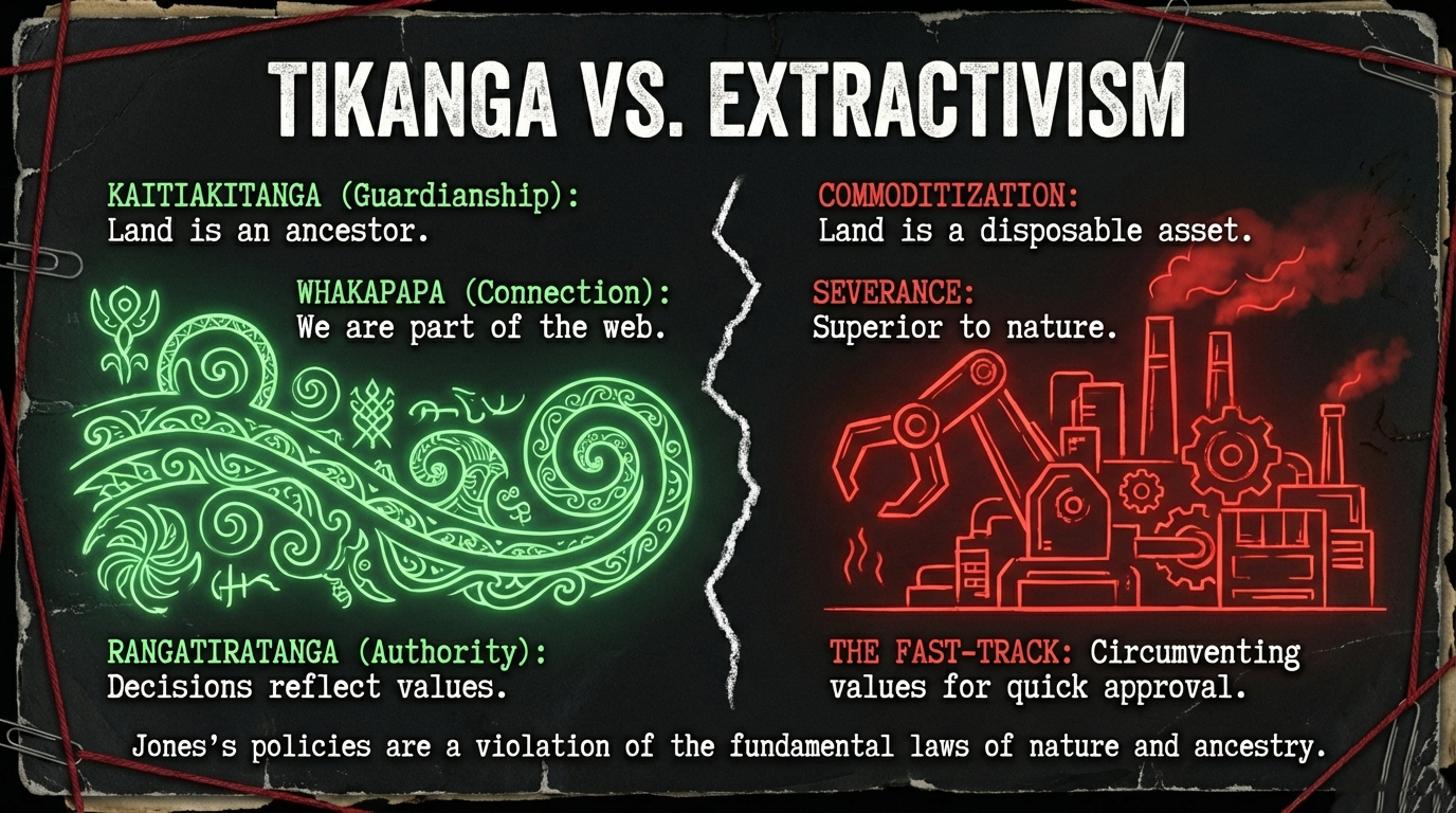 To understand the depth of harm Jones’s veto inflicts, we must examine it through te ao Māori—through the frameworks of kaitiakitanga (guardianship), mauri (life force), whakapapa (genealogical connection), utu (reciprocity), and rangatiratanga (self-determination).