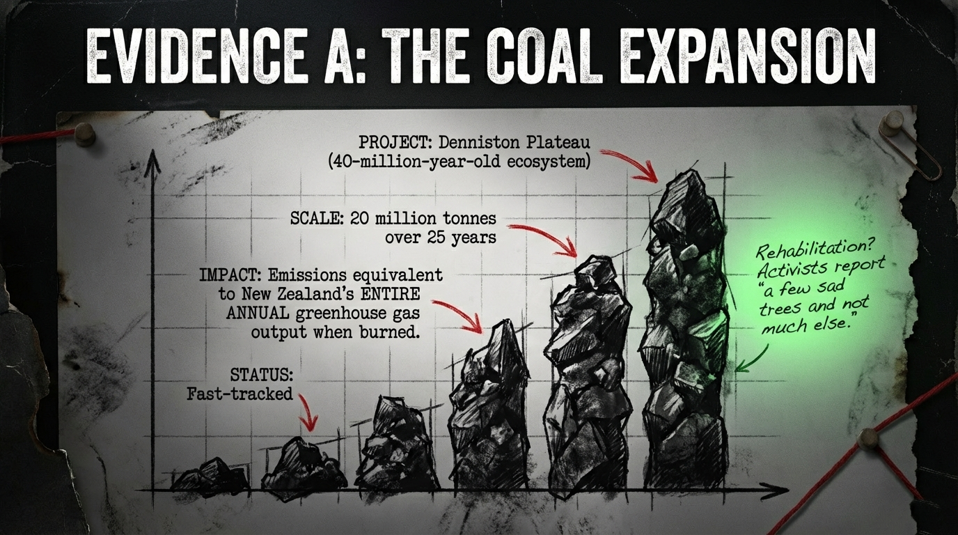 The Denniston coal expansion alone—20 million tonnes over 25 years—equals New Zealand’s entire annual emissions when burned. This single project, fast-tracked by Jones, would annually produce emissions rivaling what the entire nation must cut.