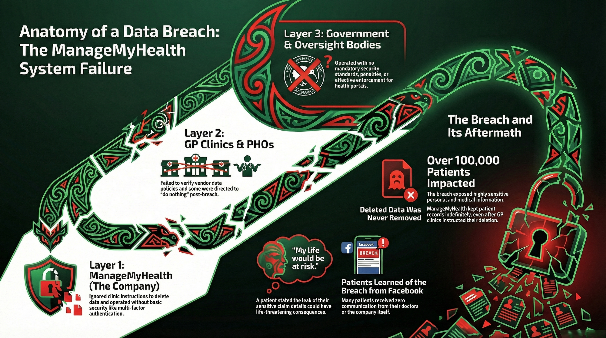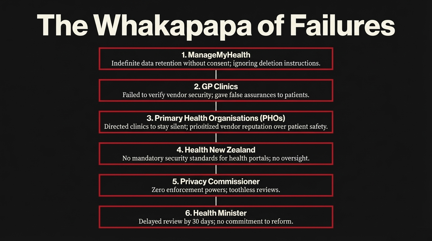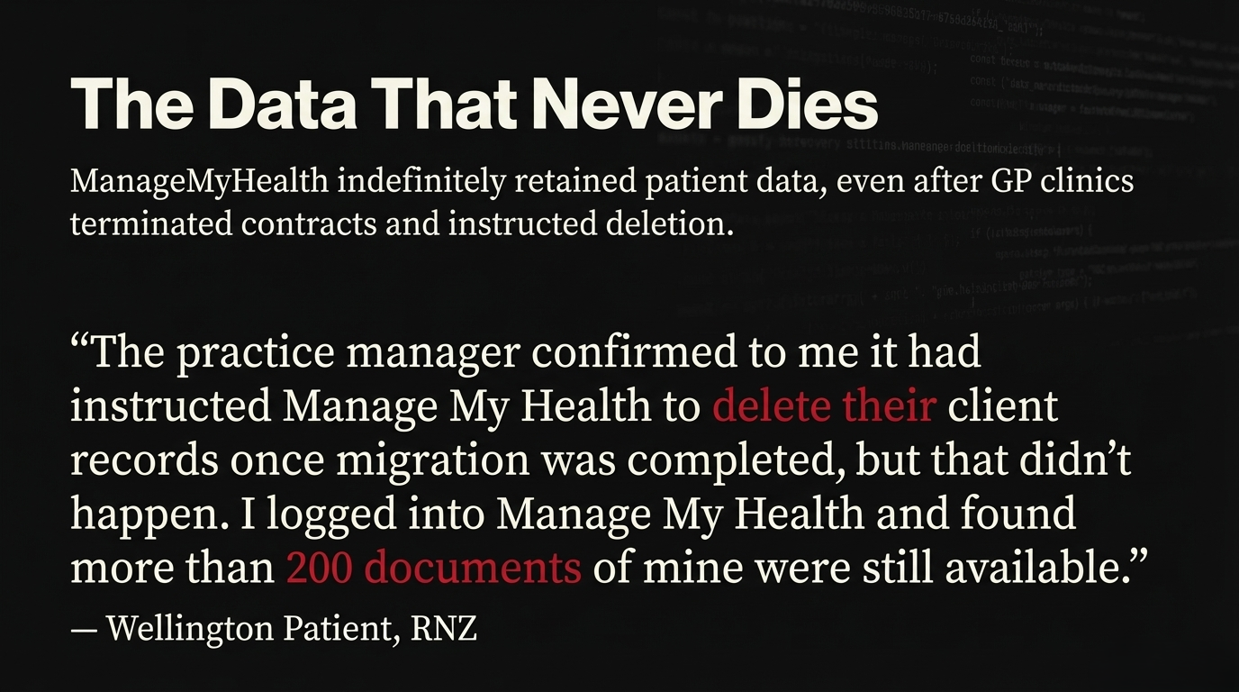 The most explosive revelation comes from RNZ’s January 8 investigation, which shows that ManageMyHealth indefinitely retained patient data even after clinics switched providers and instructed deletion.