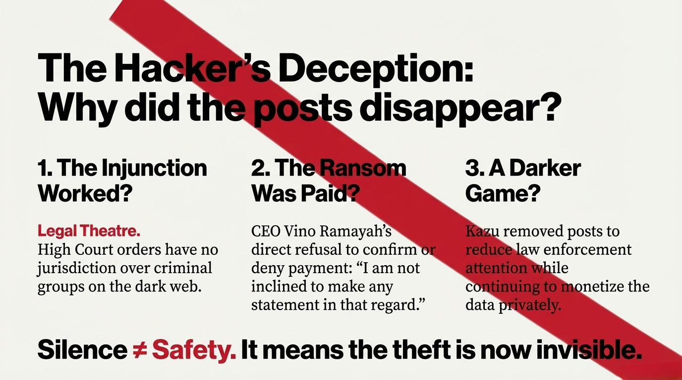 When a hacker group scrubs all evidence of a breach from the dark web within 24 hours of a court injunction, there are three plausible explanations: