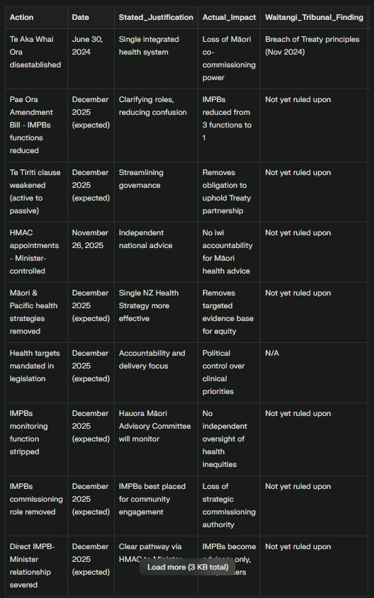 dismantle Te Aka Whai Ora (Māori commissioning authority), reduce IMPBs to advisory status (iwi commissioning authority), expand private sector contracting (market commissioning authority). The common thread? Removing Māori control over health investment while Māori remain at the bottom of every health indicator.