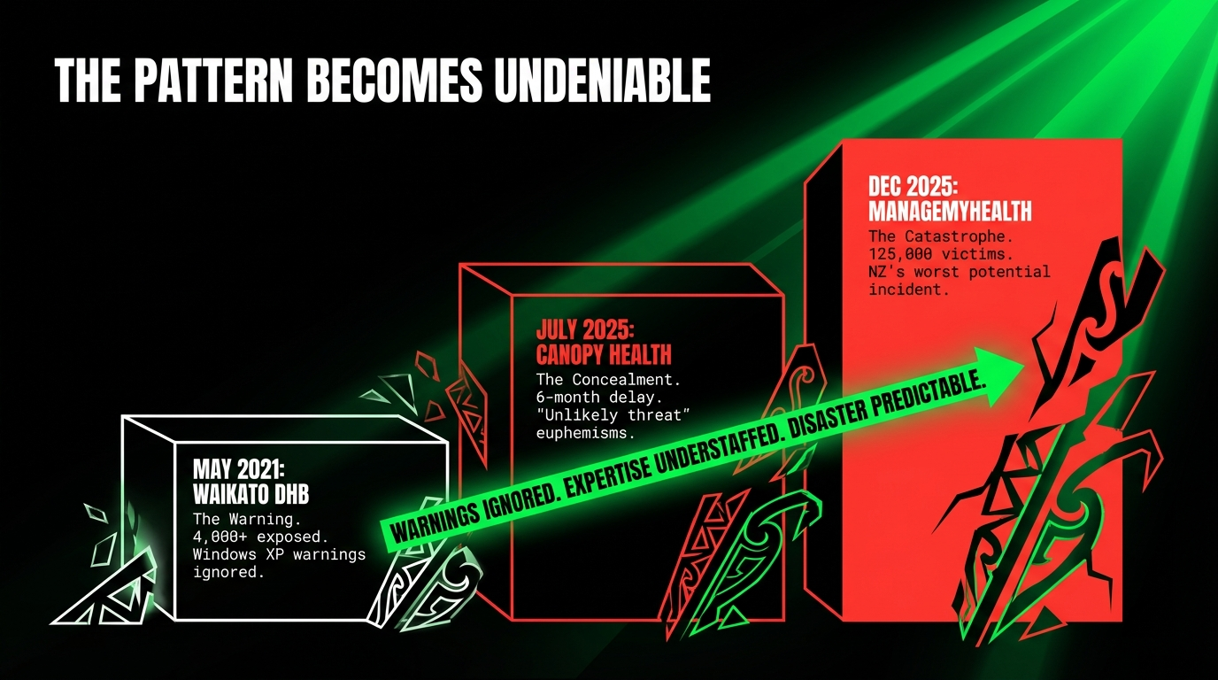 Research transparency: Analysis conducted January 12, 2026, using RNZ, ODT, NZ Herald, 1News, Kinetics cybersecurity analysis, ManageMyHealth updates, Canopy Health disclosures, and NCSC threat reports. All URLs verified active. Pattern analysis based on verified breach timelines. No synthetic data used.