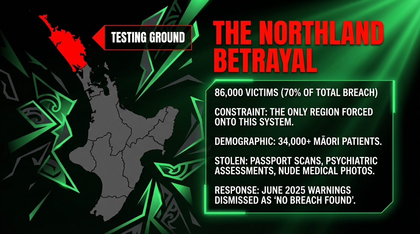 86,000 victims—70 percent of the total—are from Northland, the only region where Health NZ uses ManageMyHealth as RNZ documented and previous reporting confirmed.