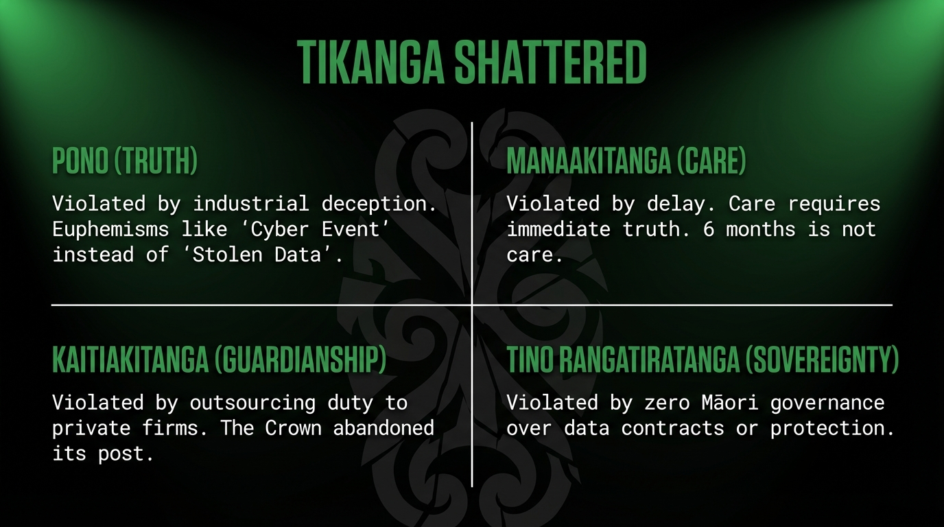 Manaakitanga: The duty to care requires immediate notification when health data is stolen. Breast cancer patients deserved to know within days, not months. Northland patients deserve accurate information, not four different counts.