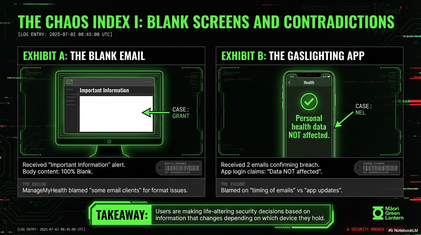 The Office of the Privacy Commissioner received an anonymous warning in June 2025 alleging “names, email addresses and passwords were exposed” as ManageMyHealth acknowledged and 1News reported. ManageMyHealth’s response? “We investigated and did not find any breach. However, out of an abundance of caution, we forced password resets” as the company stated. Six months later: catastrophic breach.