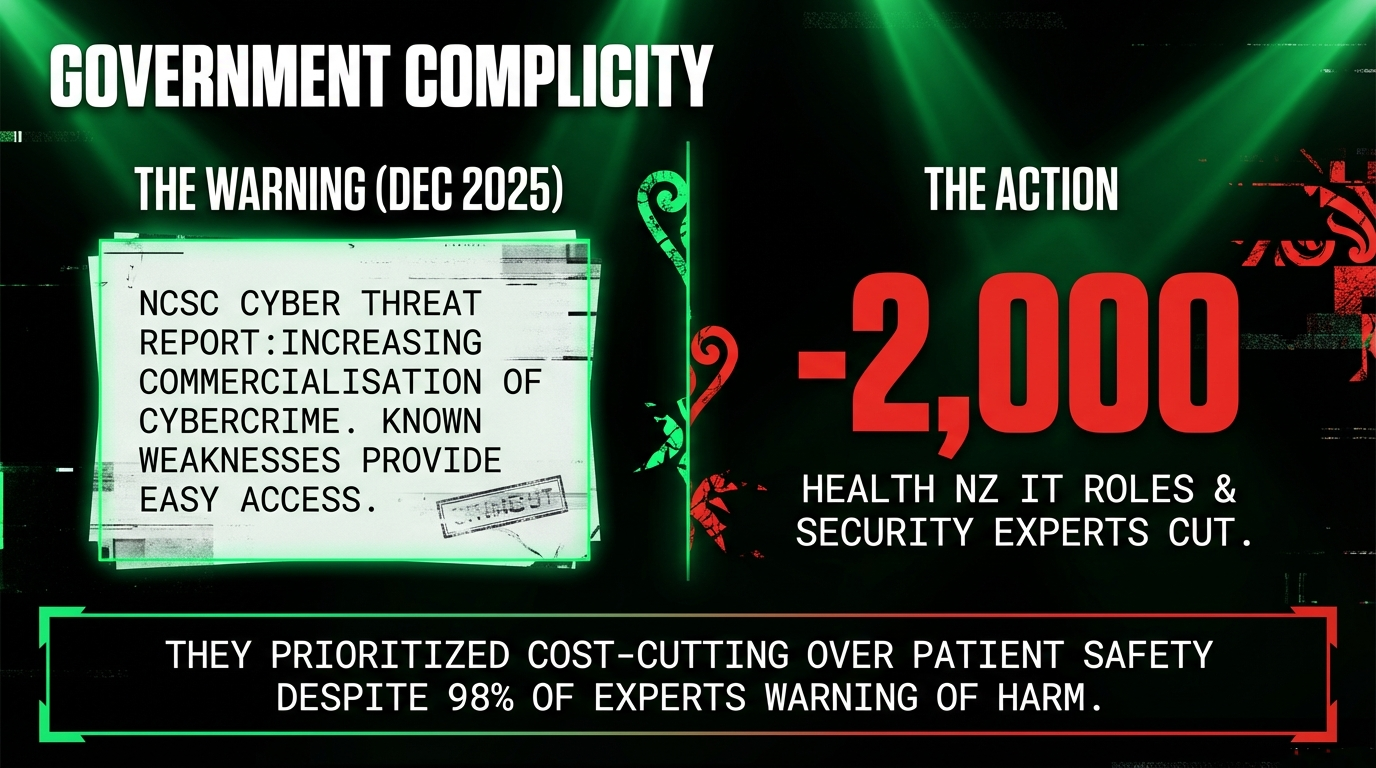 The National Cyber Security Centre warned in December 2025 that known vulnerabilities were providing threat actors “easy access.” The government ignored the warning while cutting 2,000+ Health NZ IT roles.
