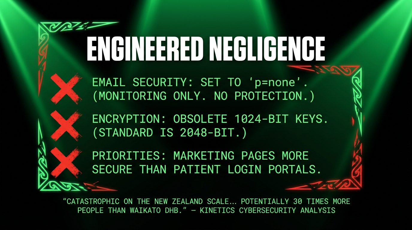 Security expert Adam Burns found baseline protections missing: email security set to “p=none” (monitoring only, no active protection), outdated 1024-bit encryption keys instead of modern 2048-bit standards, and weaker security on patient login portals than on public marketing pages as the NZ Herald’s expert analysis detailed.
