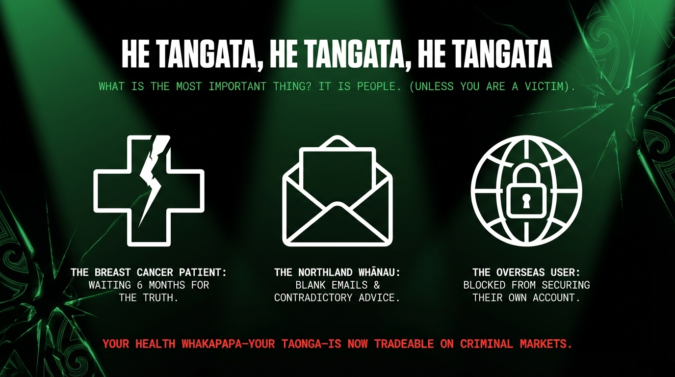 Who loses? Breast cancer patients. 86,000 Northlanders. 34,000+ Māori patients. Anyone whose most intimate health information is now for sale. Public trust in health systems, data security, and government protection.