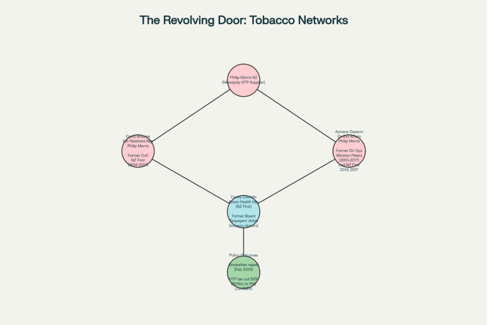 Key personnel moved from senior NZ First positions to Philip Morris corporate affairs roles, while the minister overseeing tobacco policy had prior connections to a lobby group that received tobacco industry funding.