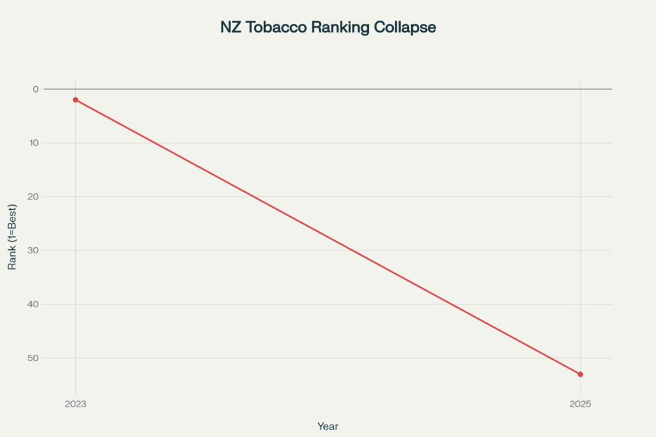 New Zealand plummeted from 2nd to 53rd place in the Global Tobacco Industry Interference Index between 2023 and 2025, representing the most dramatic fall of any country in the history of the report.