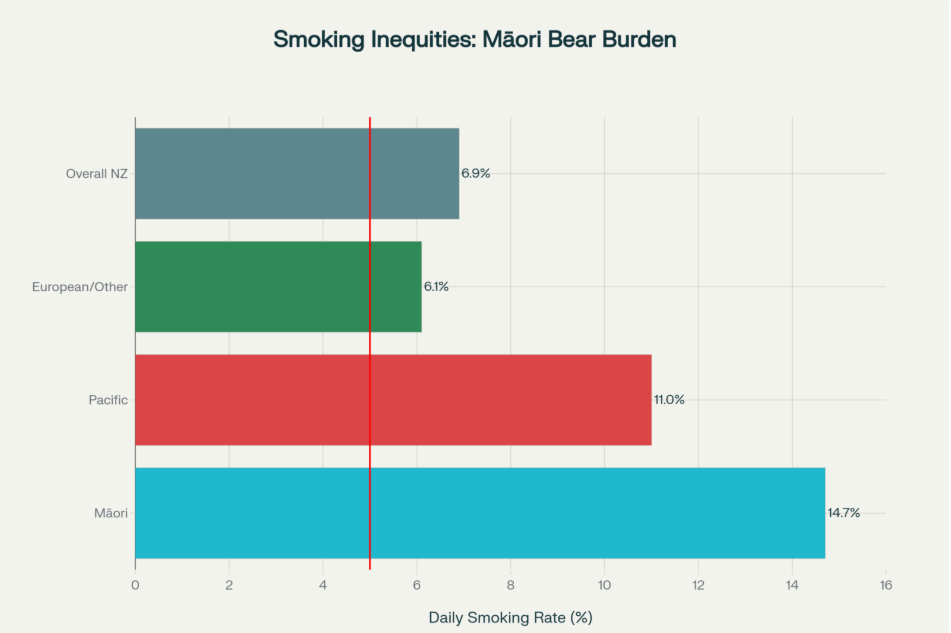 Māori smoking rates (14.7%) are 2.4 times the rate of European/Other New Zealanders (6.1%), with all groups above the Smokefree 2025 target of 5%.