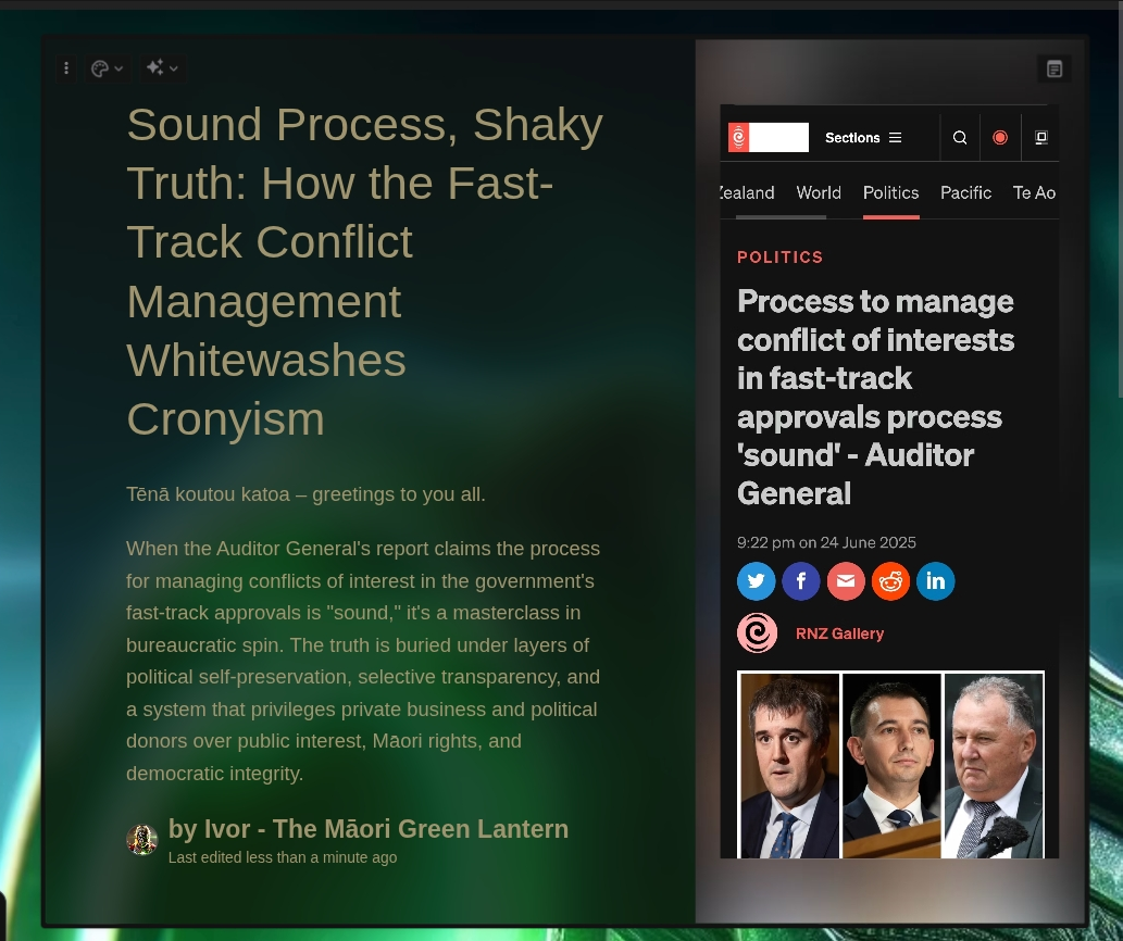 The government and its media mouthpieces want you to believe that the fast-track approvals process is robust, fair, and above reproach. “Process to manage conflict of interests in fast-track approvals process 'sound' – Auditor General,” trumpets RNZ, echoing the government’s own talking points123. But this is a half-truth at best. The real story is one of hidden conflicts, opaque decision-making, and a system designed to benefit the powerful few. This essay exposes the misleading nature of the “sound process” claim, unpacks the deeper risks for Māori and democracy, and calls out the neoliberal and white supremacist logic underpinning the fast-track regime.