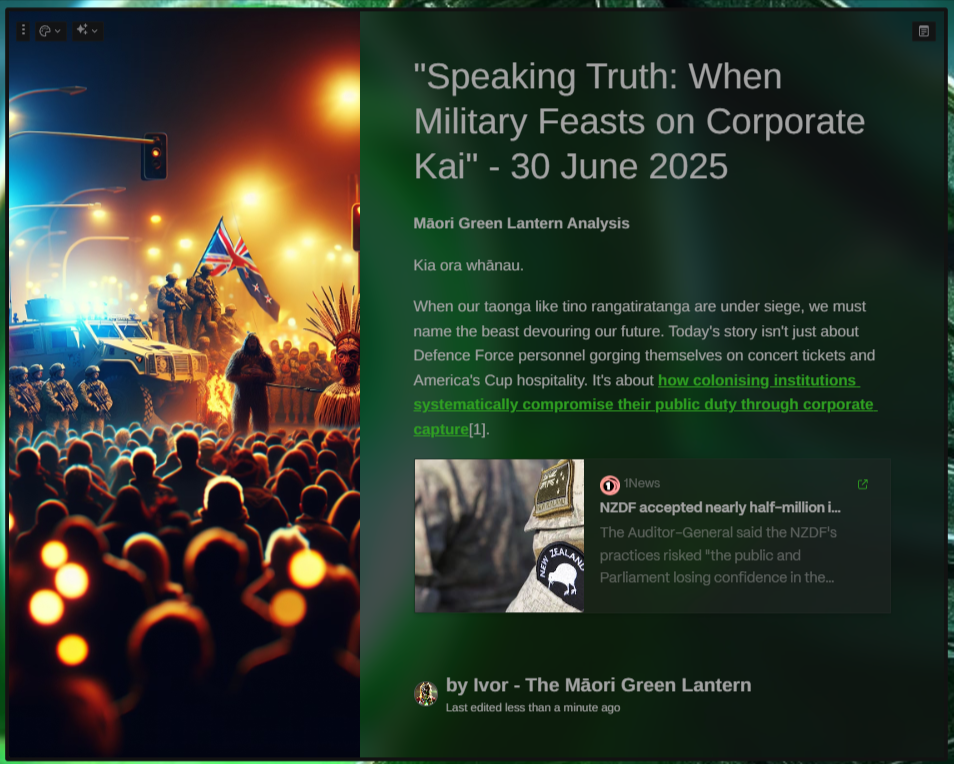 When our taonga like tino rangatiratanga are under siege, we must name the beast devouring our future. Today's story isn't just about Defence Force personnel gorging themselves on concert tickets and America's Cup hospitality. It's about how colonising institutions systematically compromise their public duty through corporate capture1.