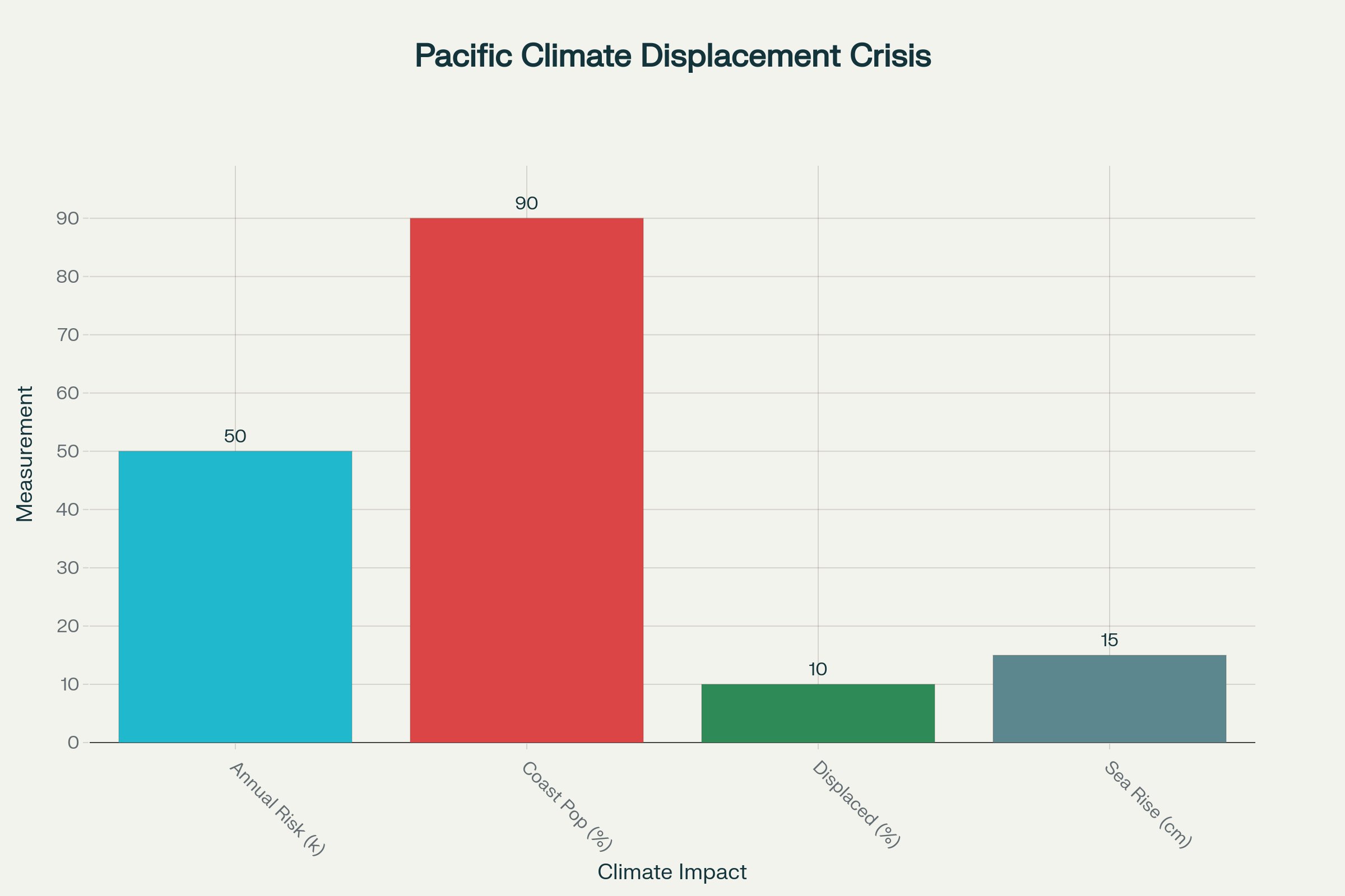 This chart quantifies the actual harm facing Pacific peoples while colonial powers obsess over surveillance: 50,000 annual displacement risk, 90% population near coast, 10% already displaced, and 15cm sea level rise above global average.