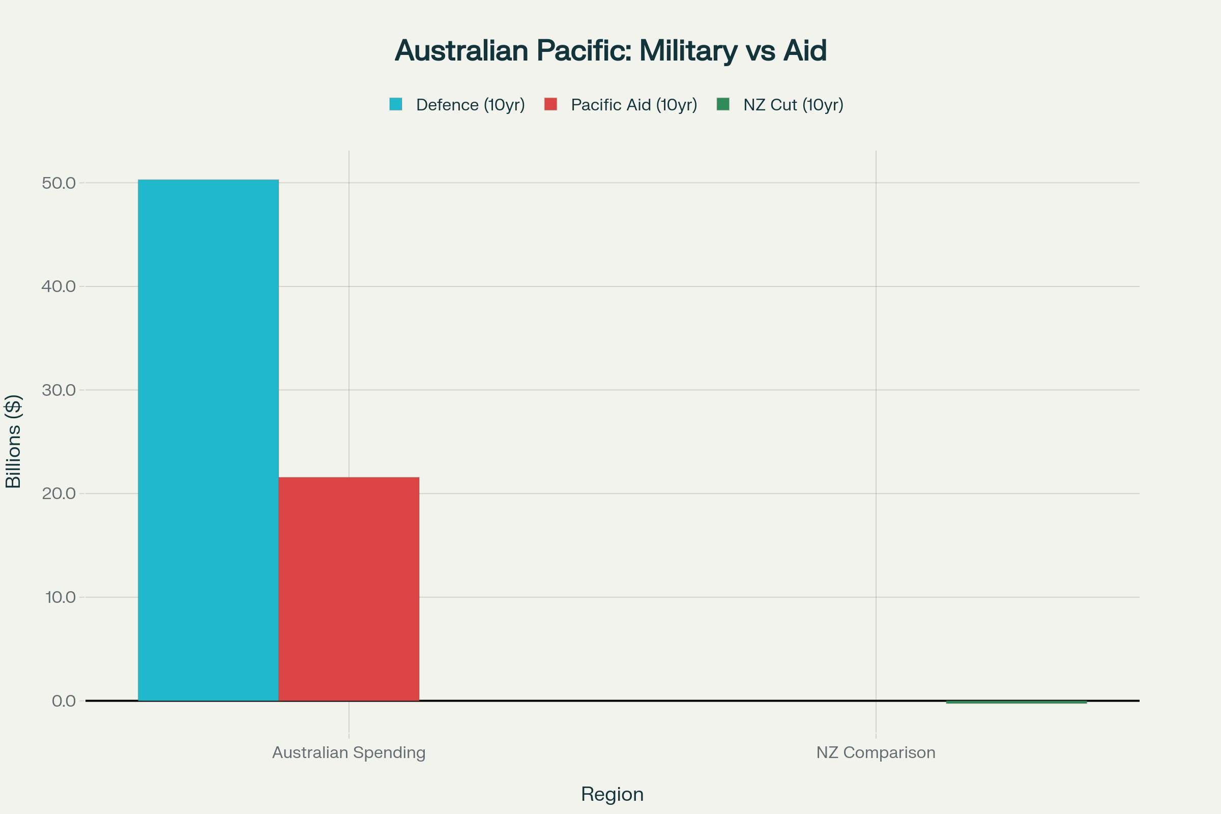 This chart shows the brutal hypocrisy: Australia increases military spending by $50.3 billion over a decade while providing $2.157 billion annually for Pacific development aid. New Zealand cuts Pacific aid by $26 million. The militarization massively outpaces genuine development partnership.