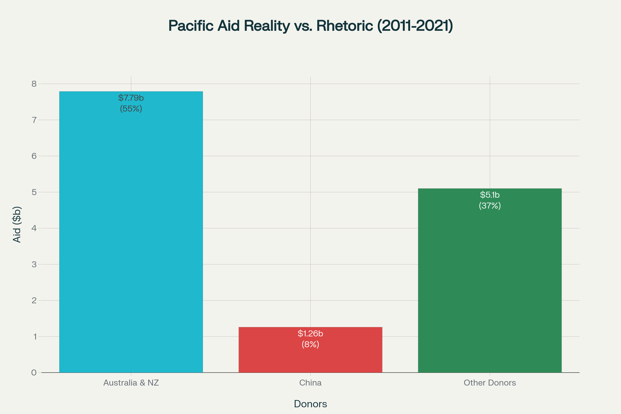 Pacific aid 2011-2021 showing Australia/NZ provide 55% while China provides only 8%, yet China is portrayed as the dominant threat