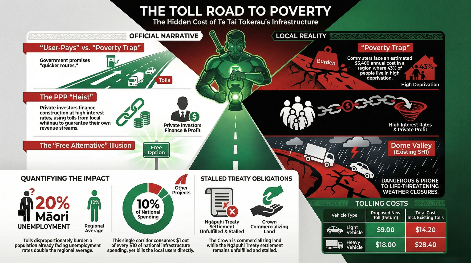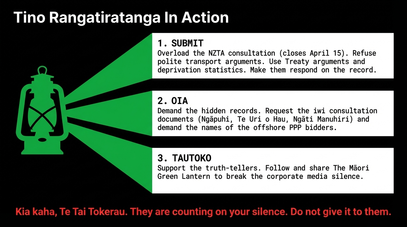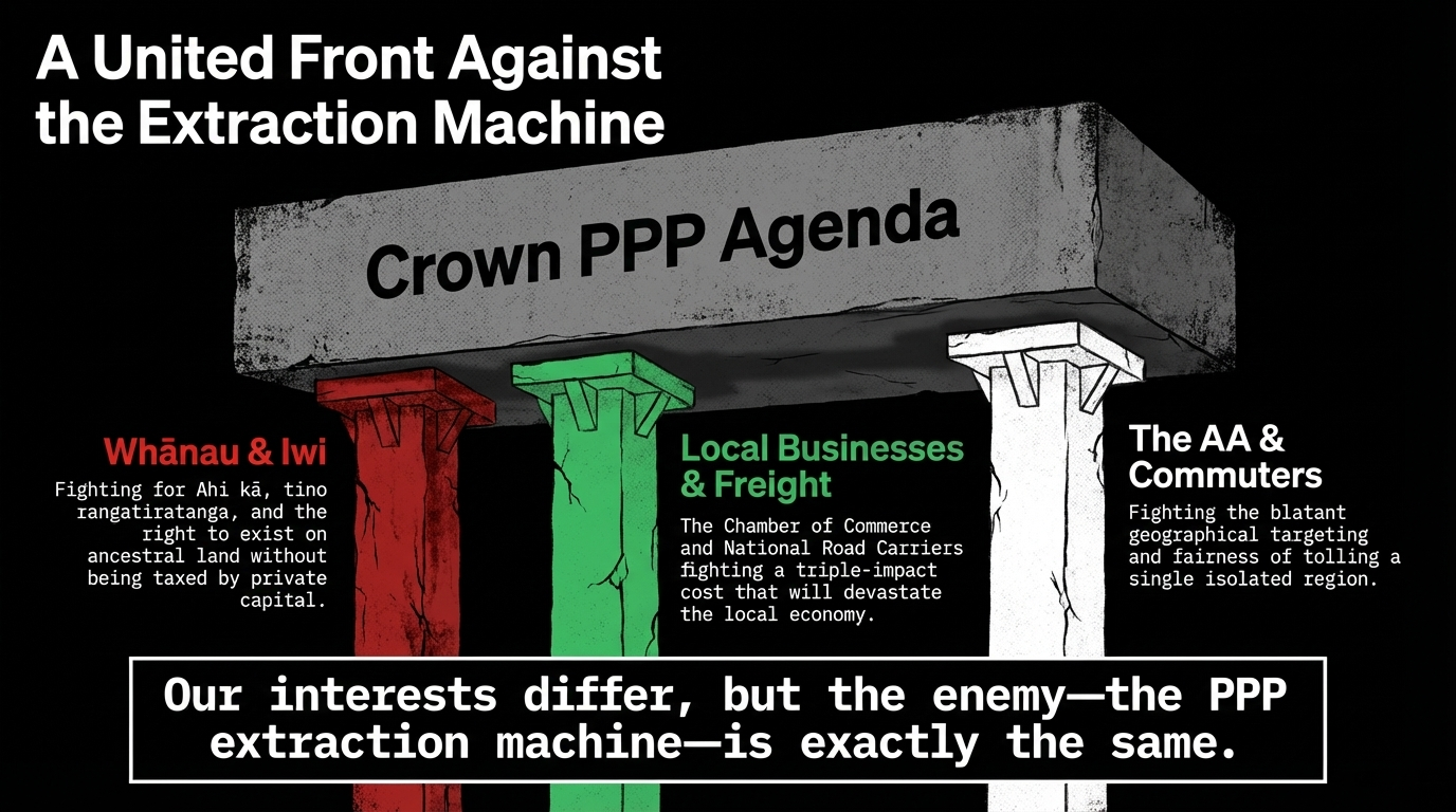 Meanwhile, as RNZ confirms, Ngāpuhi's Treaty settlement — with the largest iwi in Aotearoa, on the very land this corridor traverses — remains stalled. The Crown has not honoured its obligations to Ngāpuhi. But it is building infrastructure on Ngāpuhi land, tolling Ngāpuhi people to use it, and directing the revenue to private investors.