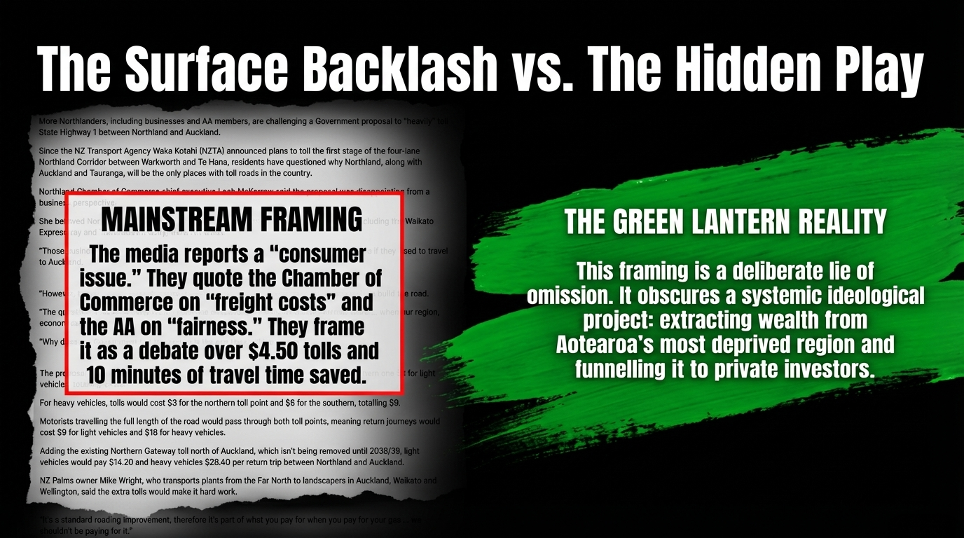 The backlash is growing. Businesses are furious. The AA is pushing back. As reported by the NZ Herald, Northlanders — including AA members — are challenging the Government's proposal to heavily toll State Highway 1 between Northland and Auckland. The coverage frames it as a consumer issue. A story about petrol prices and commute frustration. Relatable. Manageable. Safe.