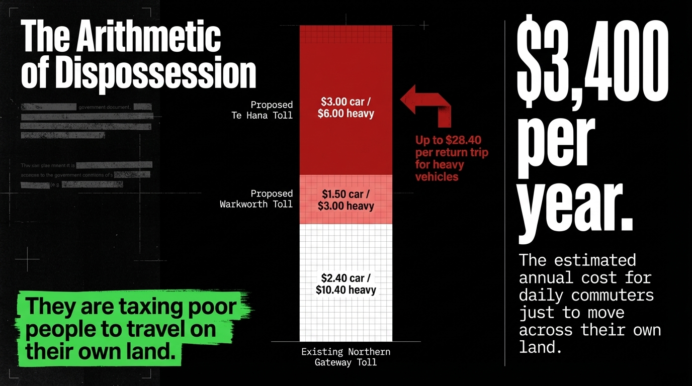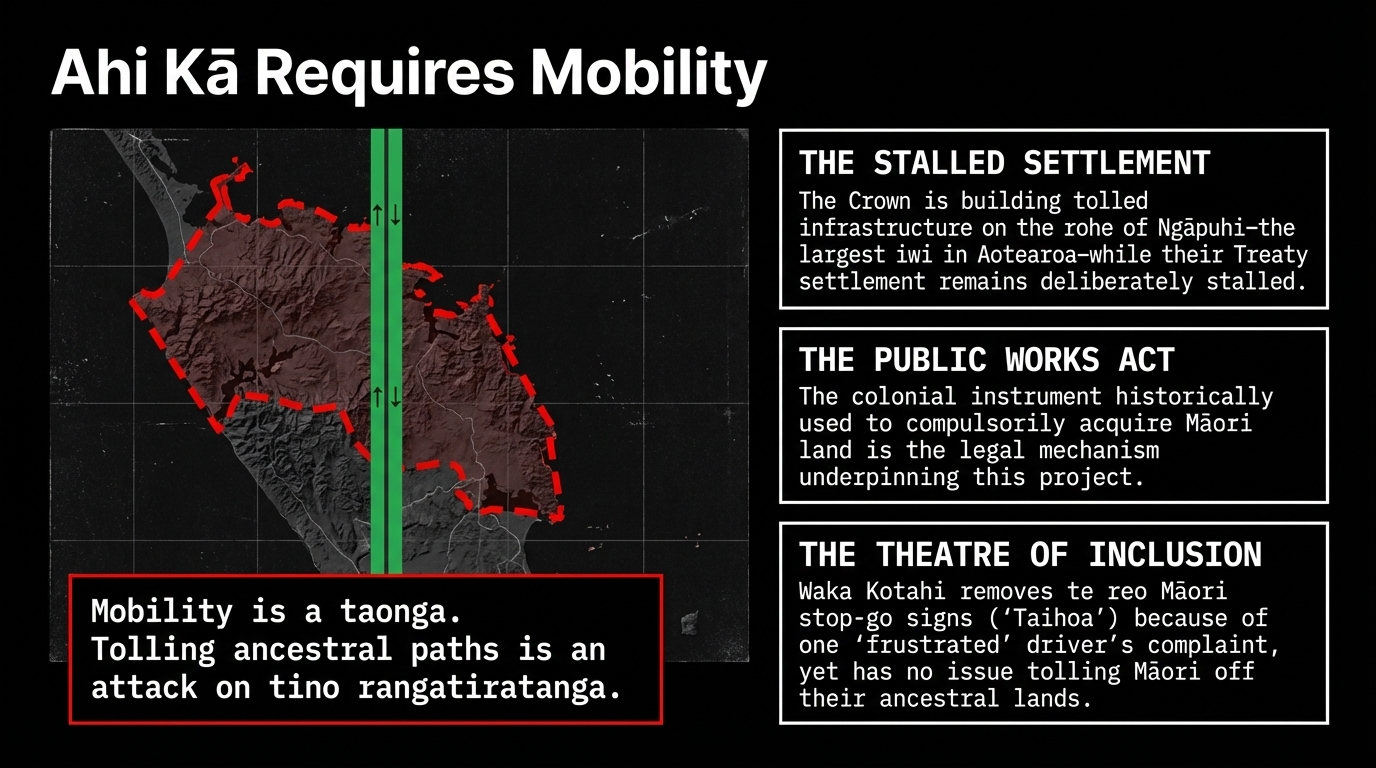 Ahi kā — keeping the home fires burning — requires physical presence on the land. Physical presence requires movement. A toll road through the heart of Ngāpuhi's rohe is not a development project. It is a mechanism of separation: Māori from their land, whānau from each other, the region from any prospect of genuine economic sovereignty.