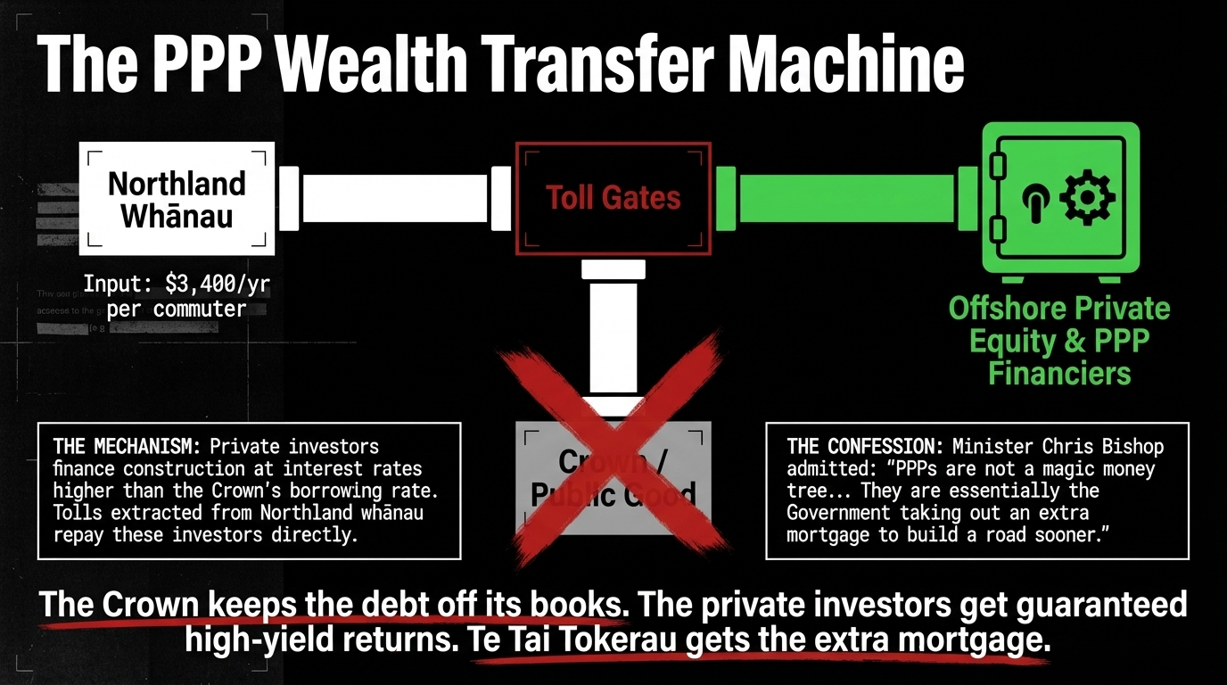Chris Bishop has constructed a toll-and-PPP machine that strips wealth from the poorest region in Aotearoa and delivers it to private investors who bear none of the social cost and carry none of the whakapapa. He has enshrined this machine in legislation. He has rushed procurement to make it irreversible before an election. He has done all of this while the Crown's Treaty obligations to Ngāpuhi — on the very land he is commercialising — remain unpaid and unfulfilled.