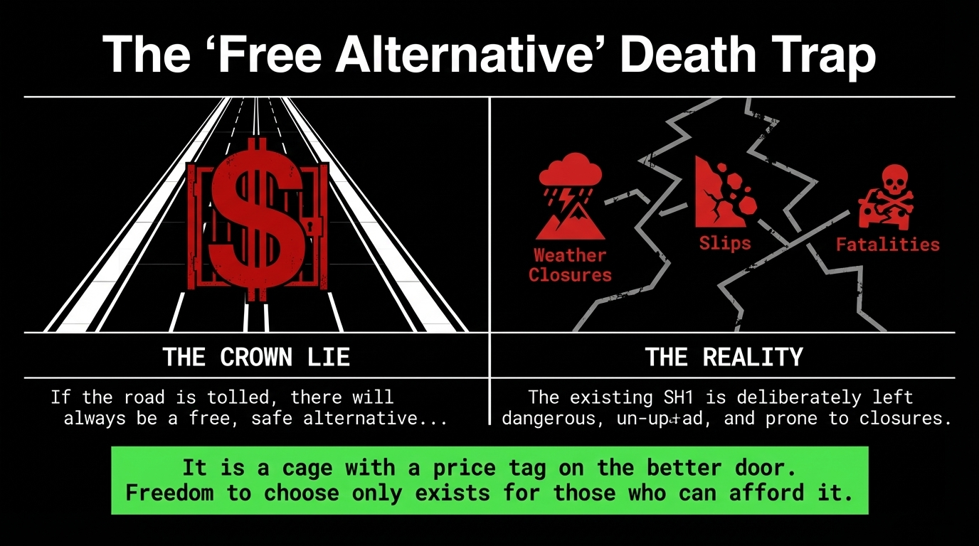 The Government's standing lie on tolling is this: there will always be a free alternative. As NZTA's archived Pūhoi to Warkworth consultation stated: "If the road is tolled, there will always be a free, safe alternative for people who don't want to pay the toll because the current State Highway 1 will remain operational."