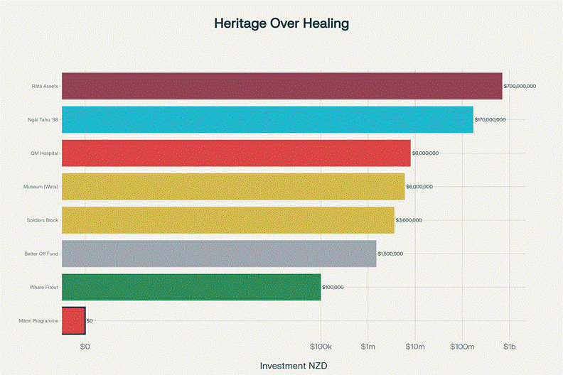 Investment priorities reveal settler colonial logic: $6 million for a museum to commemorate trauma, $100,000 for Māori cultural space, and zero dollars to replace the addiction treatment services that closed in 2003.