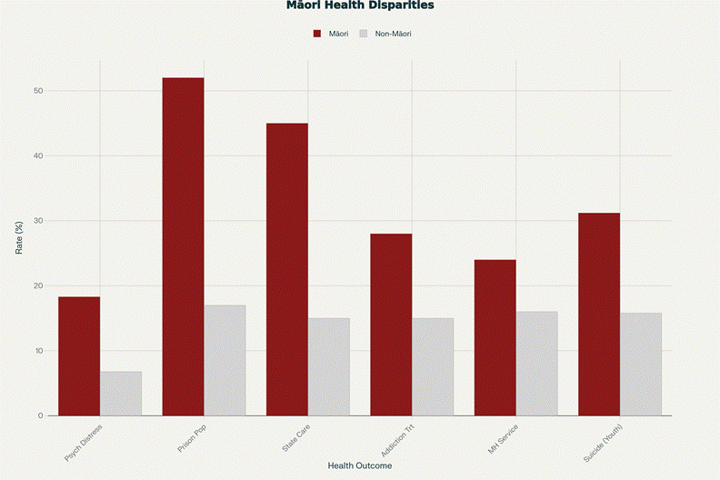 Māori are 2.7 times more likely than non-Māori to experience psychological distress. Māori comprise over 50% of the prison population despite being 17% of the general population. Historical trauma—land loss, cultural suppression, institutional racism—is directly linked to these outcomes.
