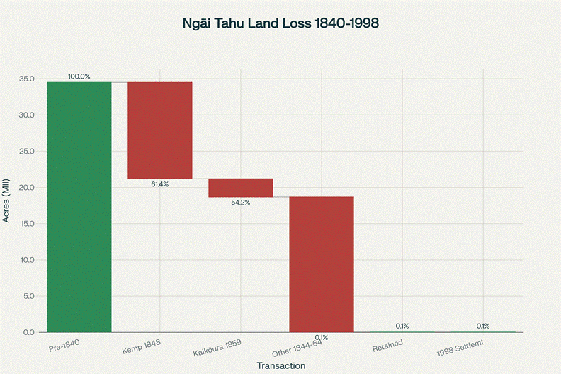 Between 1844-1864, Ngāi Tahu were forced to sell 34.5 million acres—more than half the land mass of New Zealand—for £14,750, leaving them with only 35,757 acres. The Waitangi Tribunal later called this “unconscionable” and a repeated breach of Te Tiriti o Waitangi.