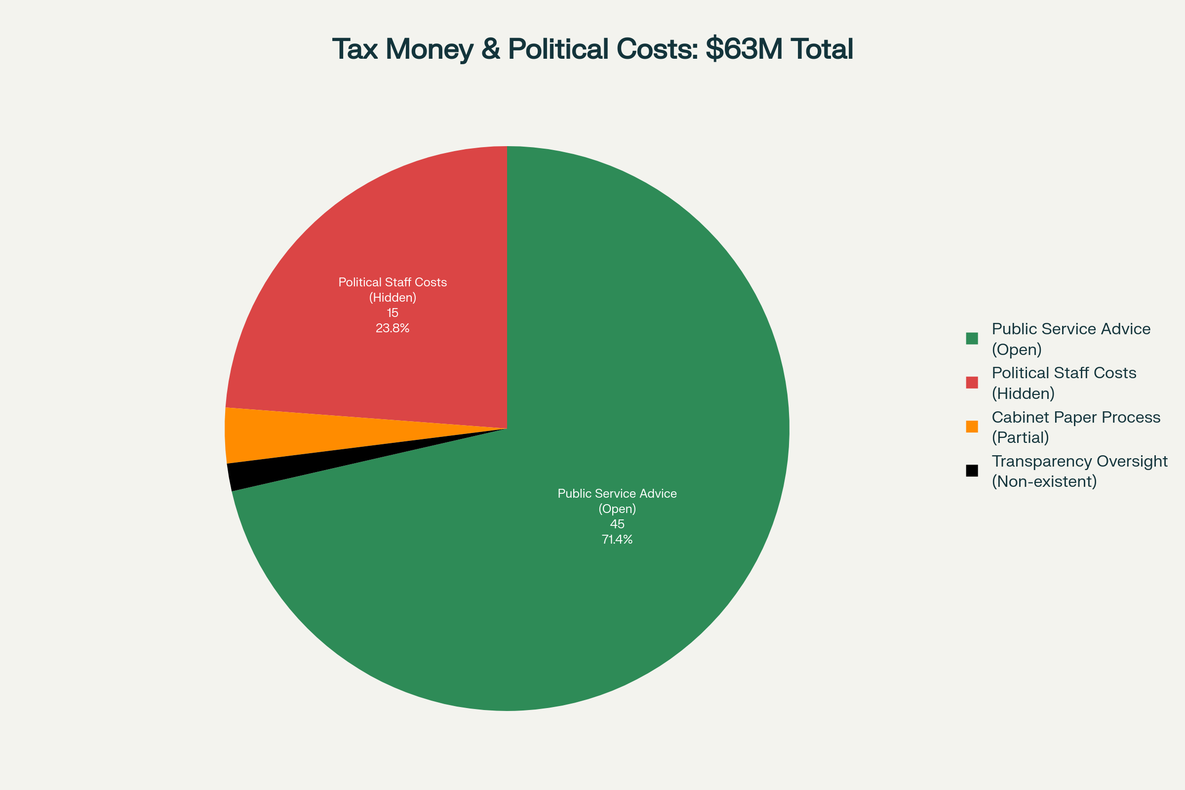 An estimated $63 million annually funds government advice systems, with $15 million in hidden political staff costs and virtually no transparency oversight