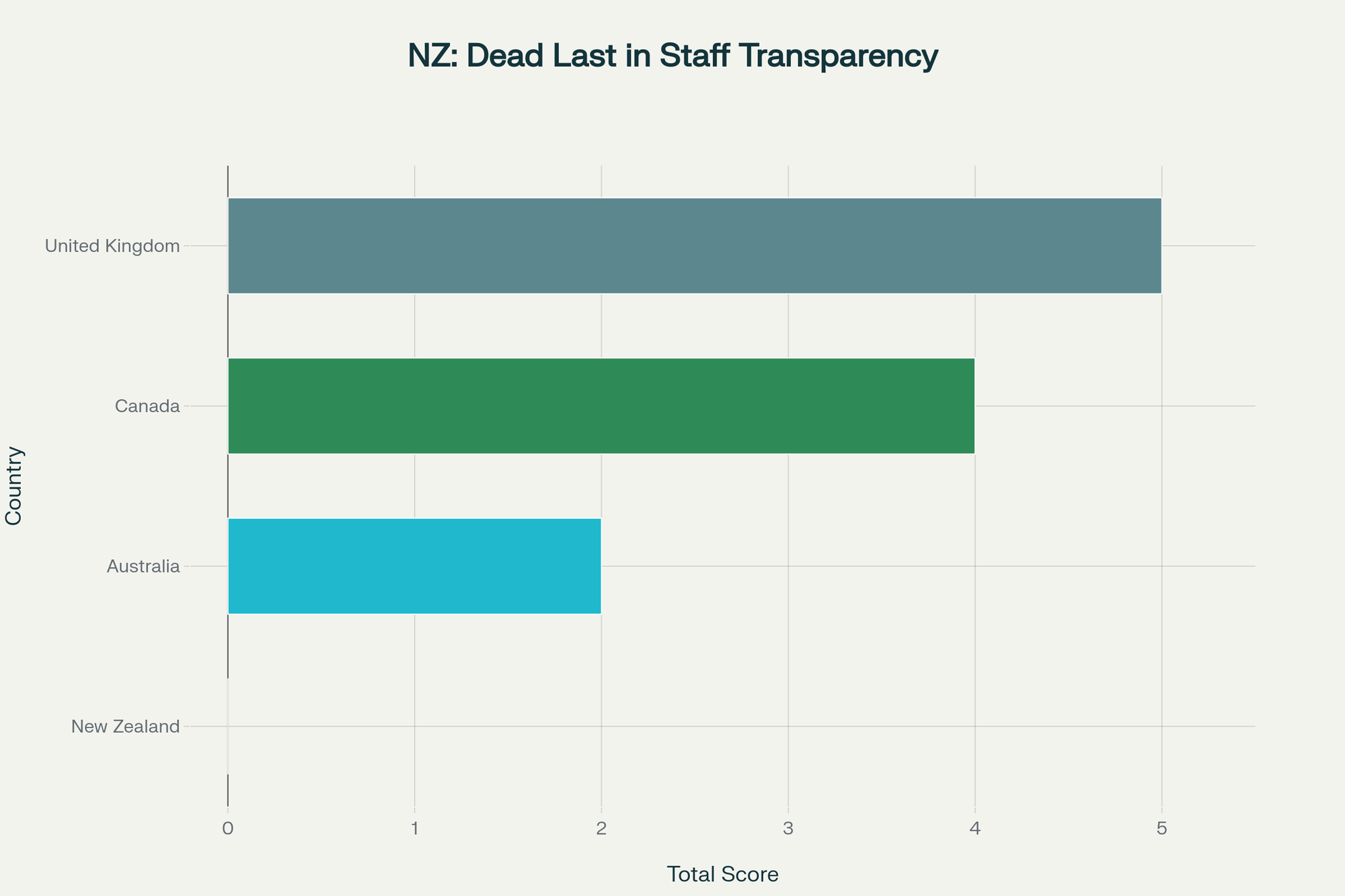 New Zealand ranks dead last among Westminster democracies for political staff transparency, with zero requirements compared to the UK’s five transparency measures