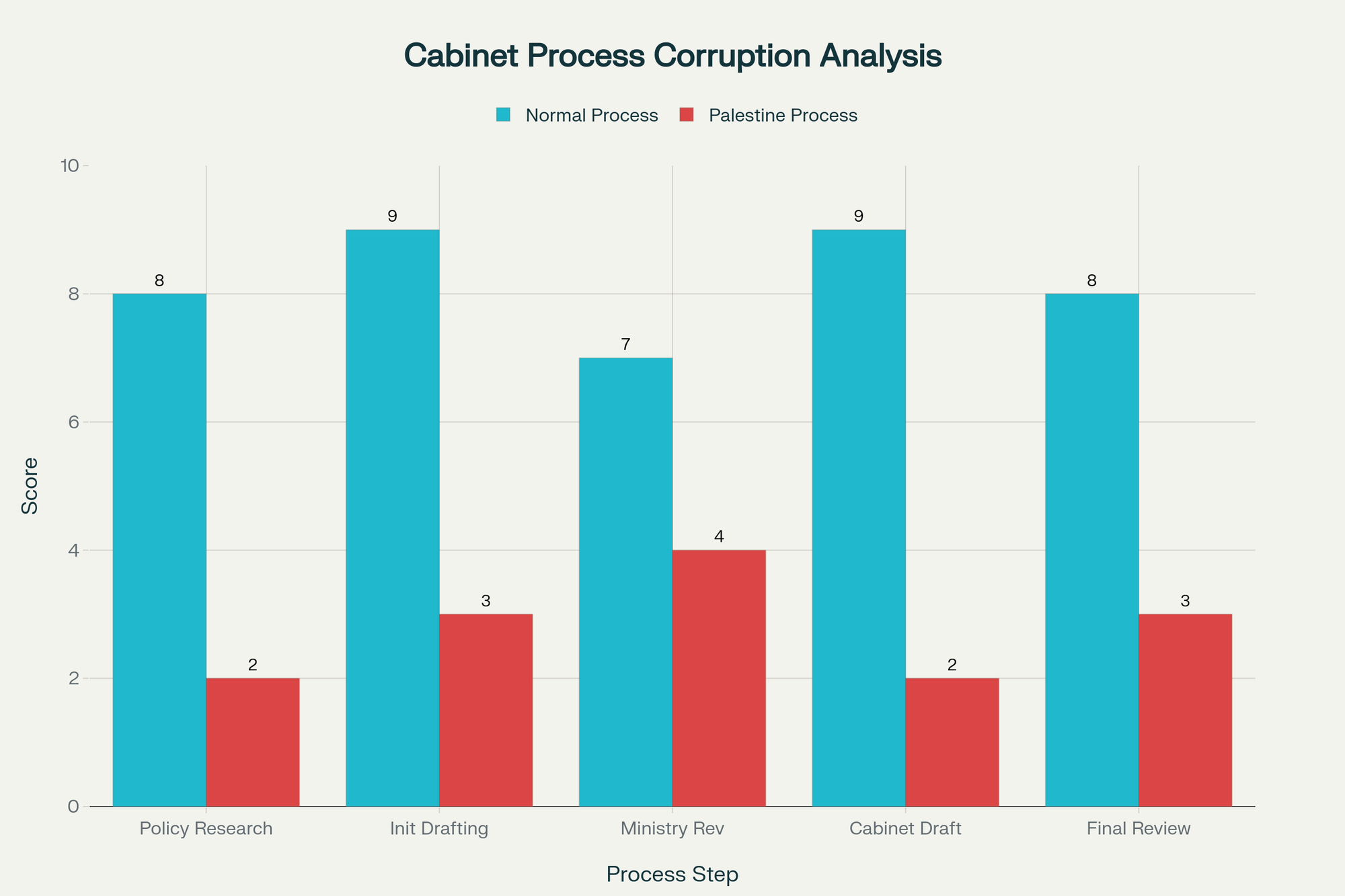 The Palestine cabinet paper process showed dramatically reduced transparency scores compared to normal MFAT-led processes, exposing how ministerial control corrupts policy advice