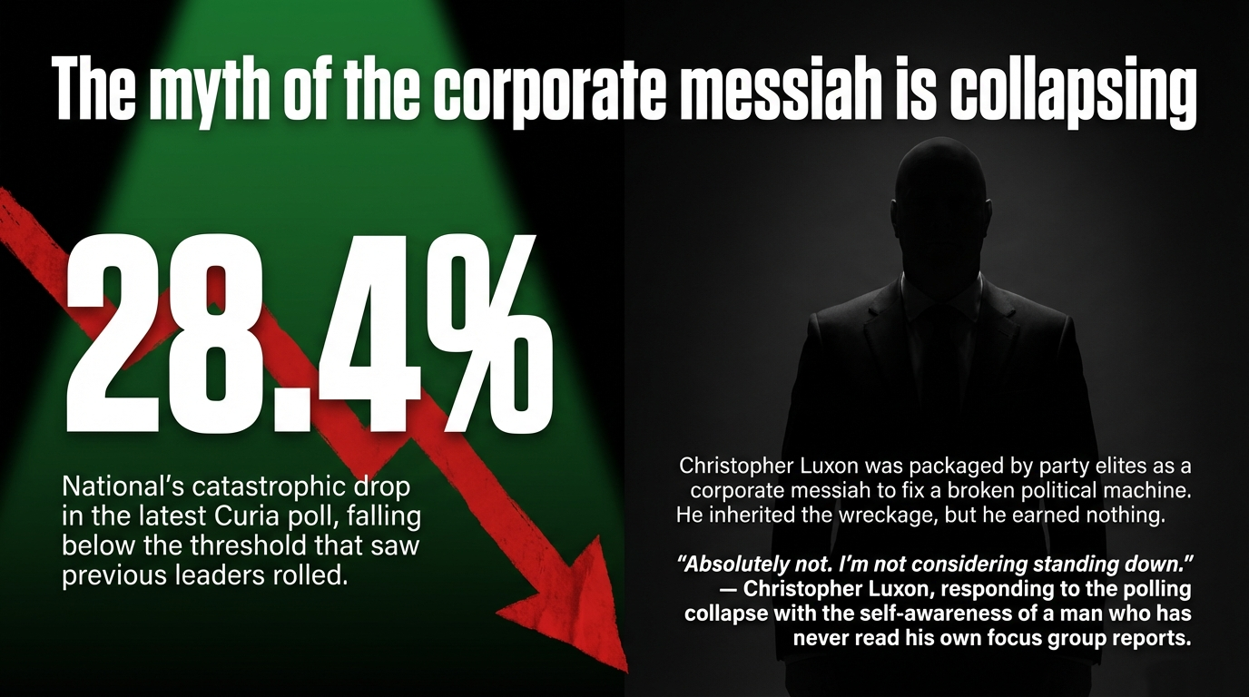 Christopher Luxon is not a kūkupa. He is a battery hen who escaped a corporate coop, wandered onto the marae of Parliament, and now struts around the paepae making sounds he does not understand while the whare burns behind him. He cannot fly. He cannot feed the forest. He cannot even remember what he said yesterday. And on Friday 6 March 2026, as the Taxpayers' Union–Curia poll dropped National to a catastrophic 28.4 percent — down nearly three points in a single month — he waddled to a Newstalk ZB microphone and declared, with the self-awareness of a man who has never once read a focus group report about himself: