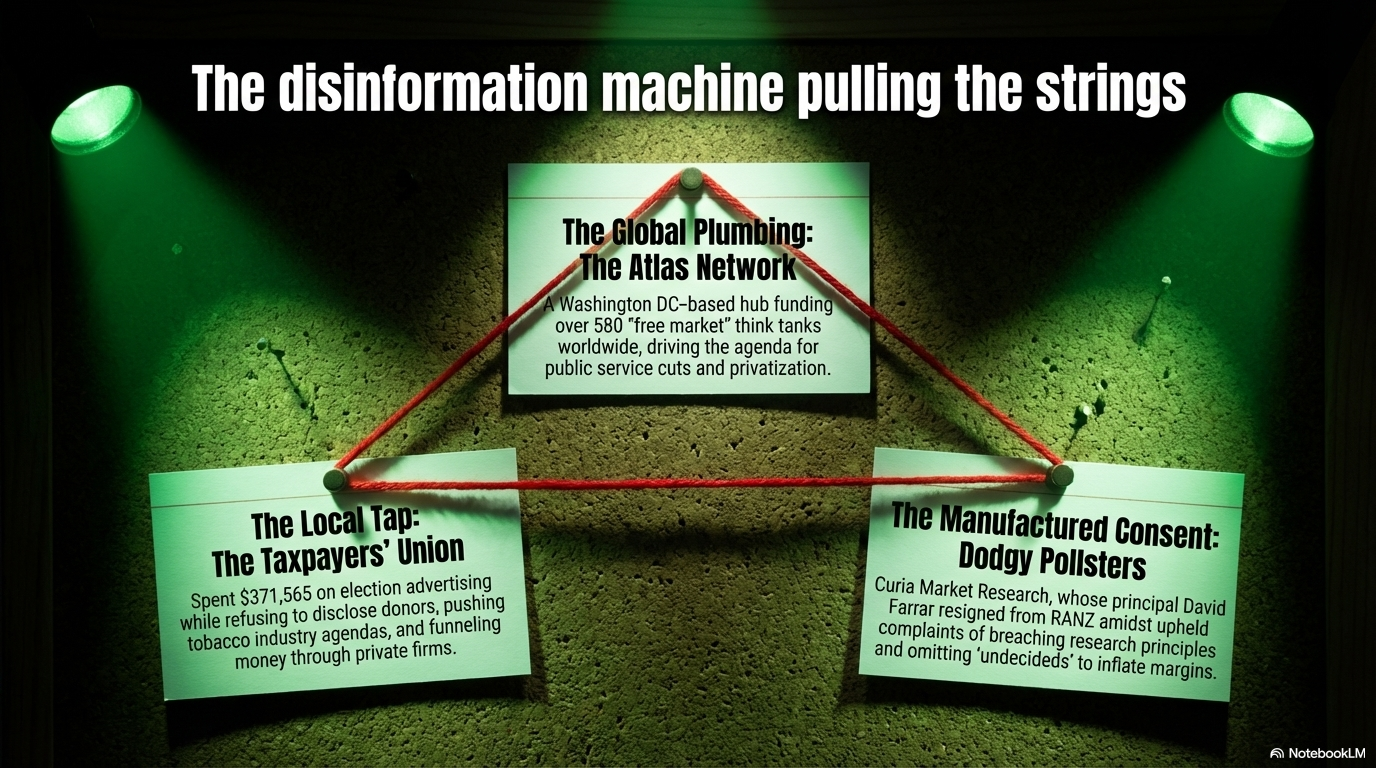 The Atlas Network is a Washington DC-based hub funding over 580 "free market" think tanks worldwide. As the ABC's investigation documents, New Zealand's Taxpayers' Union and the New Zealand Initiative are Atlas partners. The PSA's analysis confirms these organisations promote "public services cuts, denying climate change, slashing corporate regulations, eroding workers' rights, privatisation, supporting landlords over tenants" — policies that "closely align with our current government."