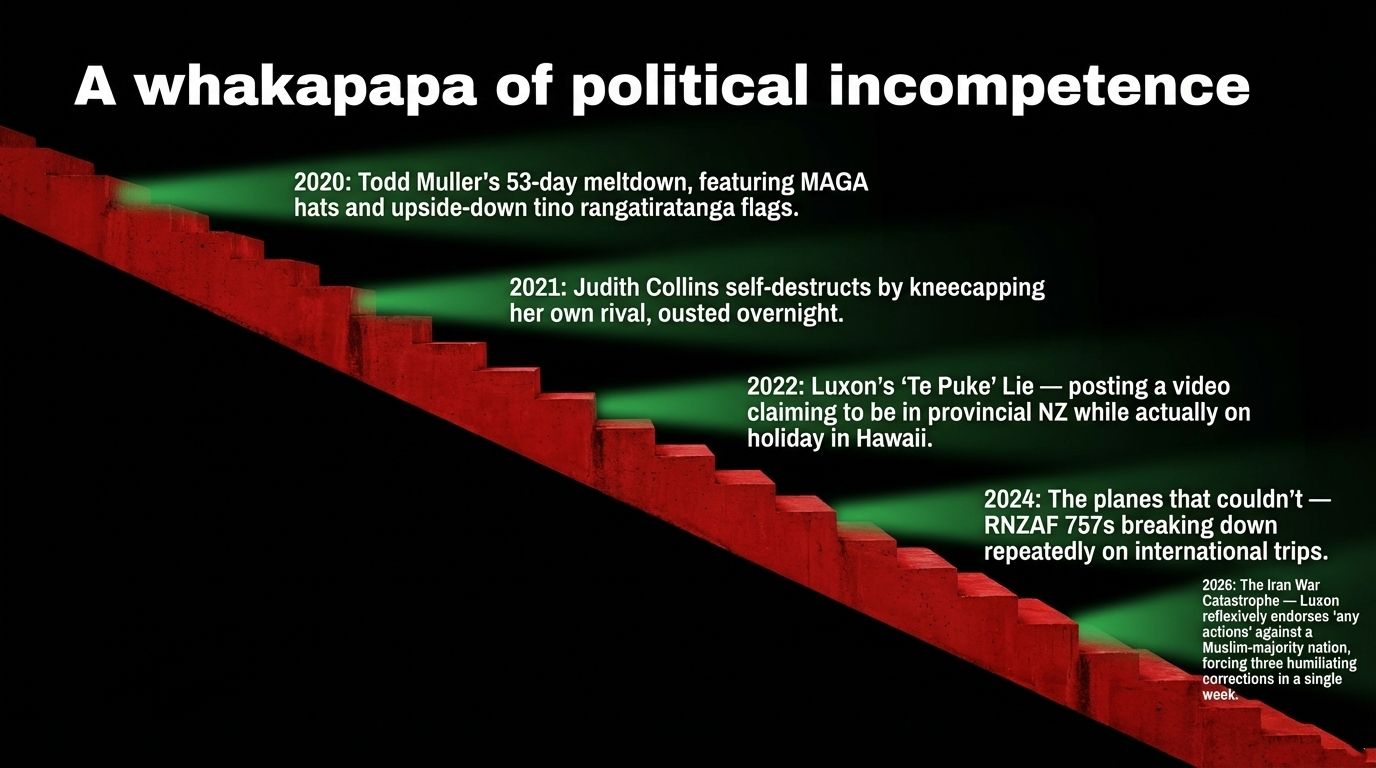Christopher Luxon has no mauri to carry. He is the fifth leader in four years of a party that cannibalised itself — from the chaos of Bridges, through the 53-day catastrophe of Muller, through the kamikaze self-destruction of Collins — until the only option left was a man nobody knew, from a corporate world that had taught him to smile, deliver quarterly results, and never, ever take personal responsibility for consequences that flow downhill.