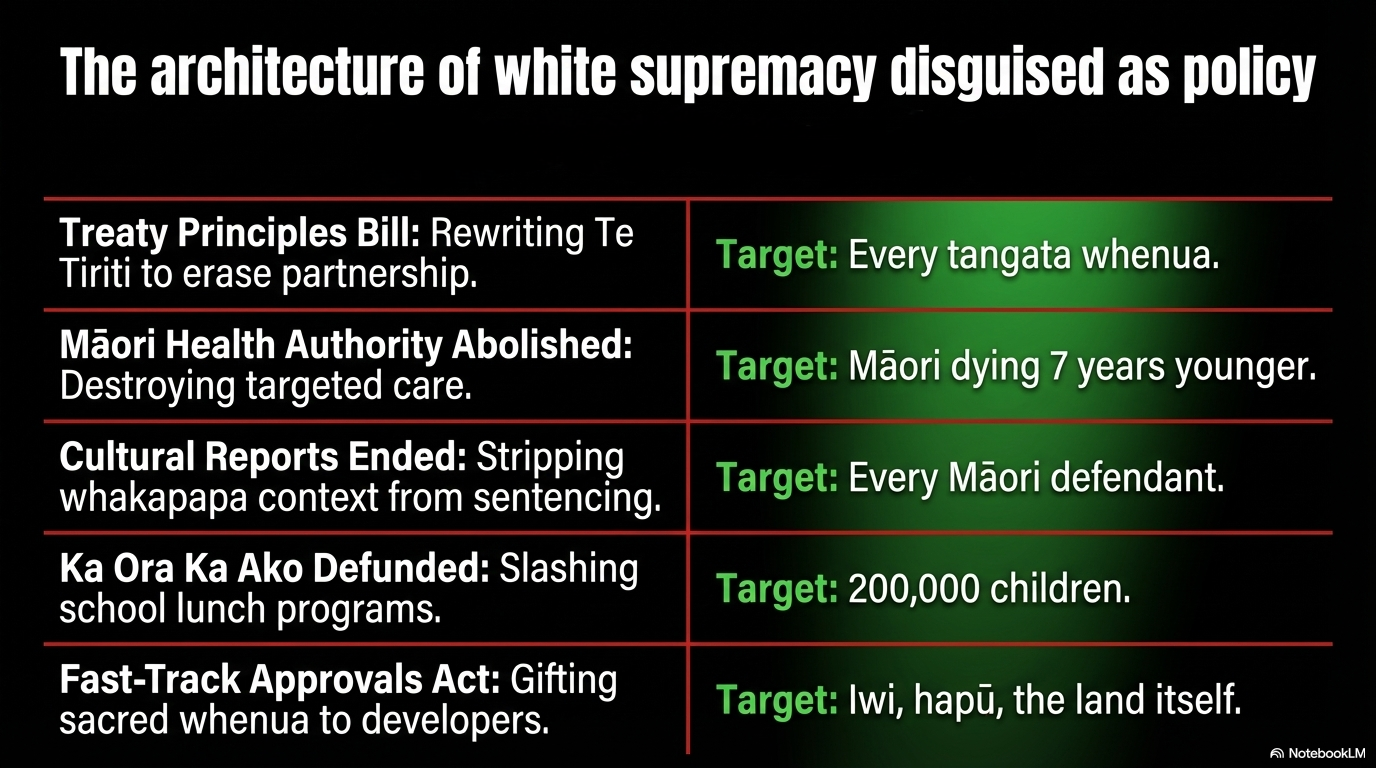 | Te Aka Whai Ora abolished | Māori Health Authority destroyed | Māori dying 7 years younger |