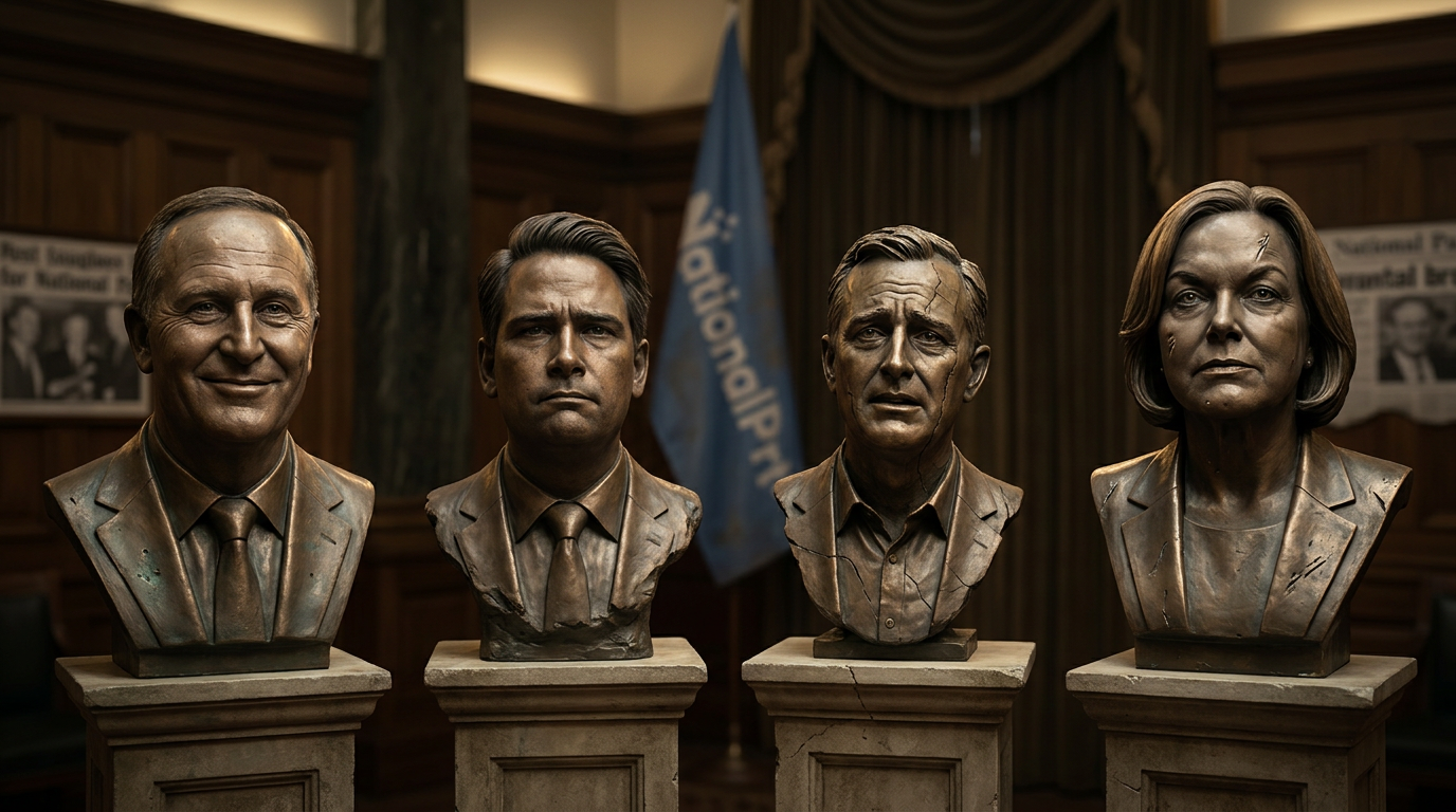 To understand the wingless pigeon, you must understand the carnage that put him on the perch. Christopher Luxon did not earn the National Party leadership through political skill, ideological vision, or service to the people of Aotearoa. He was installed — like a replacement CEO parachuted into a corporation after the board burned through four executives in three years — because the party had disembowelled itself so thoroughly that the only remaining option was a man nobody knew.