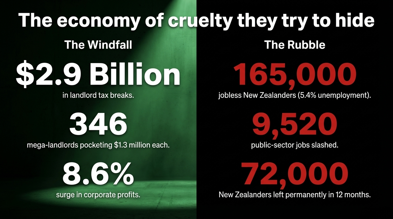 | Landlord tax breaks | $2.9B to property owners | Renters, homeless whānau |