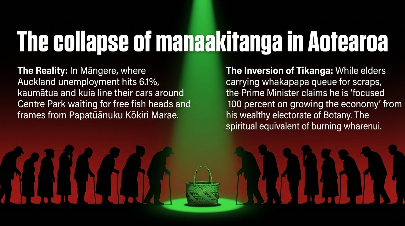 The tikanga impact — for the Western mind: In te ao Māori, manaakitanga — the obligation of care — is the measure of collective mana. When kaumātua who carry whakapapa queue for fish heads in a rich city, every principle is inverted. The Western equivalent: imagine your war veterans lining up behind a supermarket for expired bread while the CEO boasts of record profits.
