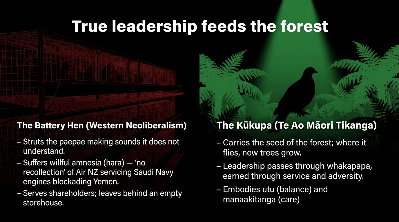 The tikanga lens: In te ao Māori, leadership passes through whakapapa. It is earned through service, tested through adversity, and validated by the people. Luxon earned nothing. He inherited the wreckage of a party that could not govern itself, and was packaged by party elites — and their Atlas-connected advisors — as the corporate messiah who would make the numbers work. He was a product, not a rangatira. And products have a shelf life.